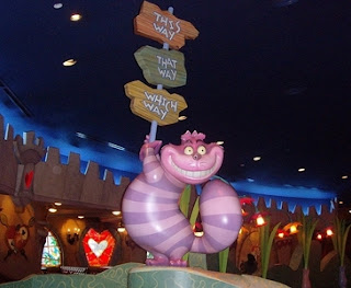 Also, at the end, there is a new statue of the Cheshire Cat holding up signs pointing in different directions: